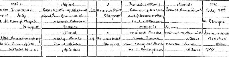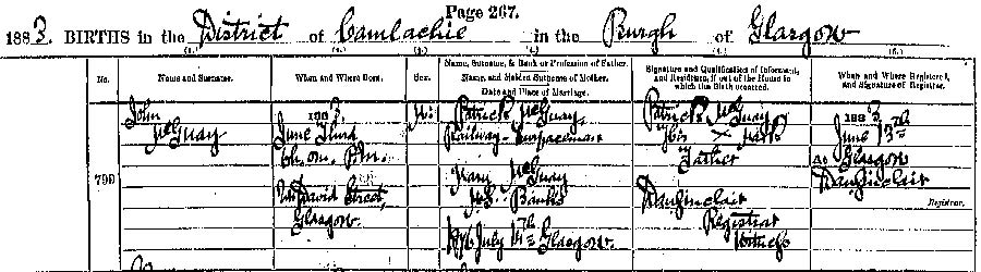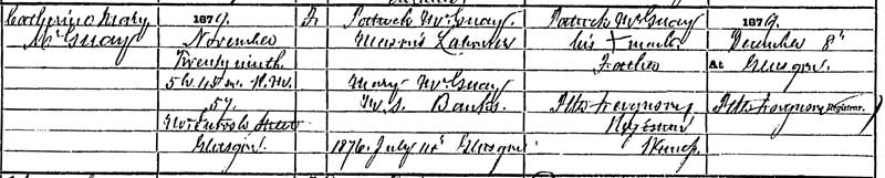 1876 Jul 14. His parents Patrick McGuay and Mary Banks marry in District of Carlton, Glasgow. Patrick is the son of Francis and Catherine McGuay, both deceased. Catherine appears to have been Nee McKirnan, He is living at 3 Armour St, Glasgow