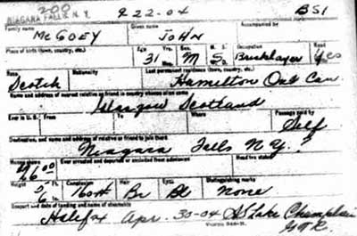 1904 April 19. A John McGuay leaves Liverpool bound for Montreal on SS Lake Champlain. He is born 1883, Scottish and a bricklayer. This appears to be our man, from age, ethnicity and trade. He states in 1910 entry to USA that he had been there previously for a 3 year stay. His US entry card confirm that it is him as it states he is a "bricklayer"