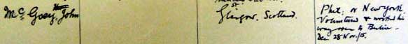 1905 Dec 6. John McGoey leaves USA as an Ordinary Seaman on the crew of SS Scottish Moors. He joined at Port Townsend, Washington State, USA.bound for Liverpool. He is born 1883 and Scottish. I cannot be certain that this is our man, but this seems to be how he returned home to Scotland.