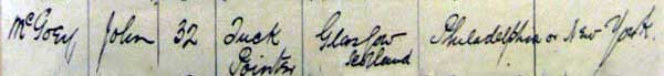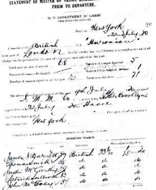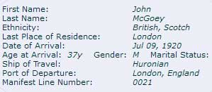 1920 Jul 22. On the crew of SS Huronian, and jumps ship in New York. Document called “Statement of Master Vessel Regarding Changes in Crew Prior To Departure”. This shows 5 crew members as ‘deserters’ not reporting back to duty to go back to London on the vessel Huronian. One of these men was John McGoey, age 34.