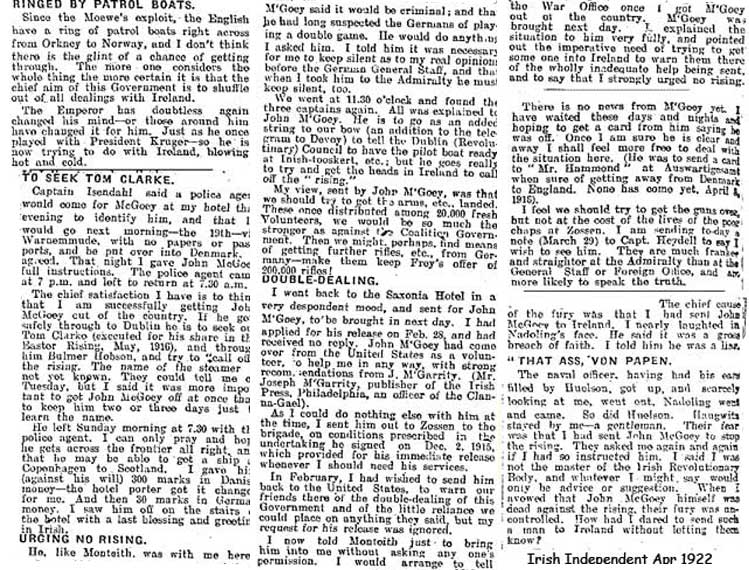 1919 McGoey was mentioned by Frank Hall of MI5 who examined the letters that Casement left with the Blüchers, and noted “With regard to John McGoey who is referred to further on in the same letter as ‘the Volunteer who had come over from America in November (1915)’ and whom Casement refers to further down on the same page as having been ‘dispatched on Sunday 19th March (1916), to Denmark with instructions to reach Dublin without delay’; I have failed entirely to trace this man or to connect him in any way with our records. The name is no doubt an assumed one but we have no record of any person who would appear to have come from America at the time stated or to have come to this country from Denmark.”