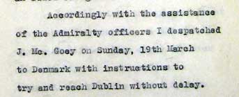 1916 Mar 19 Casement saw him off from the stairs of his hotel in Berlin at 7.30 am. The Admiralty provided a police agent “to get McGoey over the German frontier” to Warnemunde with no papers or passport and be put into Denmark, Casement adding that he was smuggled into Denmark “without the knowledge of the General Staff.”. McGoey left Casement a list of the surest men for the trip to Ireland: there are 19 men on that list, and McGoey says he had doubts about O'Toole