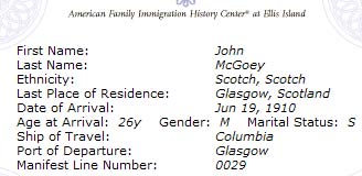 1910 Jun 19. Arrives in USA at Ellis Island. This appears to be our man, right age and place of birth. He gives next of kin as Mary McGoey, his sister at 18 Abercromby Rd, Glasgow. His entry form says he previously spent 3 years in USA. He is going to live with his aunt in Chicago, Mary Ann Kelly at Stoneyisland Av, Chicago. He is 5ft 7.75" and fresh complexion, grey eyes. The 1901 census shows that he did have a sister Mary and following the death of his parents, his sisters are his next of kin.