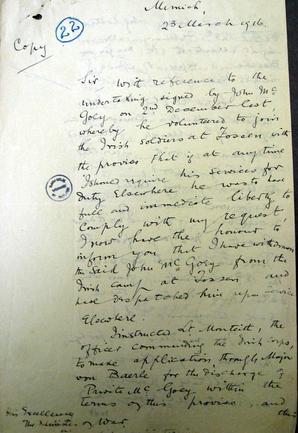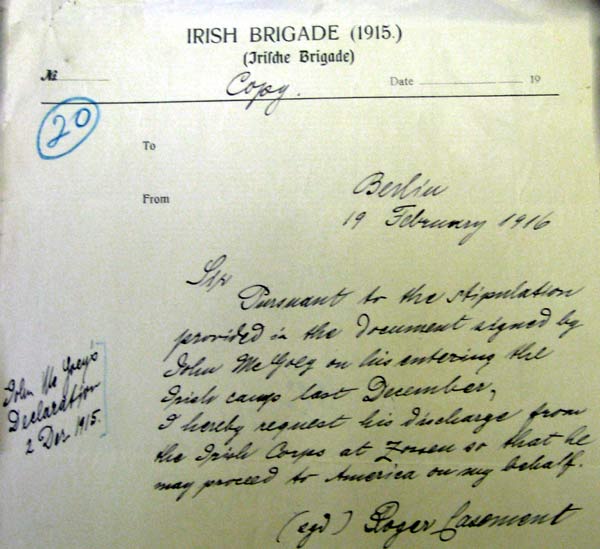 1915 Dec 2. Casement writes to von Baerle that McGoey was willing to join Irish Brigade