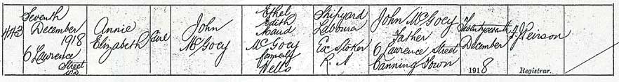 1918 Dec 7. Child born Anne Elizabeth McGoey . The Birth certificate gives her as born at 6 Lawrence St, Canning Town, daughter of Ethel Enid Maud McGoey, formerly Wells, and John McGoey, shipyard labourer, ex-stoker RN