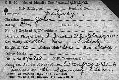 There's a Trimmer John McGoey listed in the Mercantile Marine Reserve medal rolls, he was entitled to the British War Medal and the Victory Medal. However he doesn't appear to have claimed them as there is no entry in the 'How issued or disposed of' column. His discharge book number is listed, 876858, rather than the name of the ship he served on.