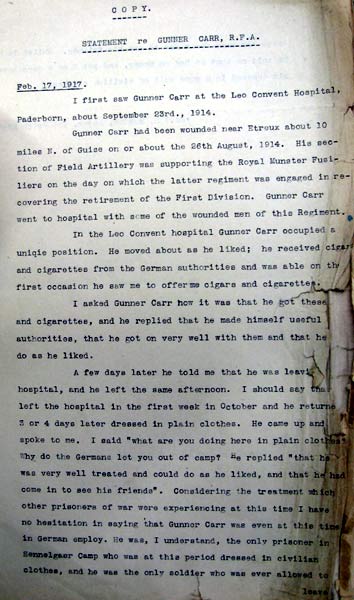 1917 In a section dealing with postal censorship in a booklet titled "Forms Issued in Connection with the Work of The Central Prisoners of War Committee" published by the British Red Cross and Order of St John in 1917, they give this service number in a list of men known to have joined the Irish Brigade and includes Carr.