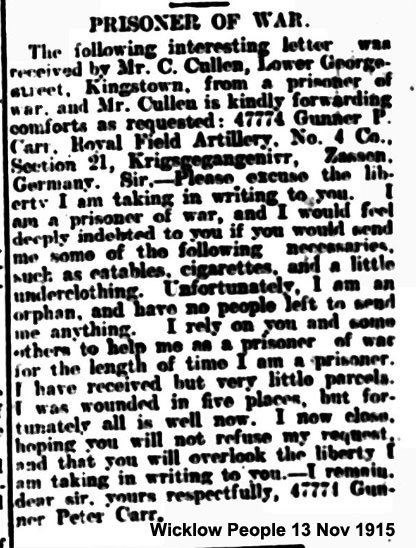 Roll of Irish Brigade in Zossen confirms service no. and born Dublin. His mother and father are both dead by 1915. Gunner Peter Carr (47774) – 118 Battery, RFA is in WO 141/9 as being in Irish Brigade. Prior to enlisting he was a fireman on Casement's notes. McDonagh calls him Irish/English, one of 3 he call this. Her did volunteer for service in Egypt if called upon. He appears to have been sent to Quadsow punishment camp in Spring of 1917, and when he returned attempted suicide by cutting his throat with a rusty razor. Although saved by the German doctors, he never fully recovered and died 15 Sep 1918. He is now buried in Berlin SW CWGC grave.