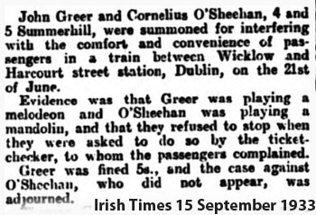 1933 he was living at Summerhill, Dublin, when he was arrested on a train for playing his accordion and harassing the passengers.