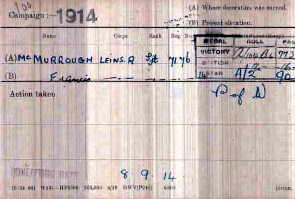 Sgt McMurrough of Leinster Regt was alleged to have been the first volunteer, but withdrew when he heard that there was no money in it for him. Quinlisk reords this hapening during Casements first address to the NCOs at Limburg on 6 Dec 1914.