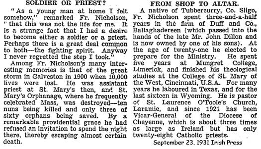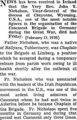 He arrived at St Lawrence O'Toole Parish Chuch, Laramie. Their records say Father John T. Nicholson, was a native Irishman who had come to the United States as a youth to make his seminary studies, but who never lost his affection for Ireland. It is related of him that he spent some time in Germany in 1916, and that, while there, he tried to aid Sir Roger Casement in securing German assistance for the Irish cause. In doing so he aroused the wrath of the English Government. Happily, he did not fall into their hands.