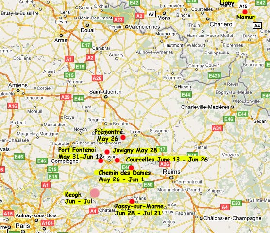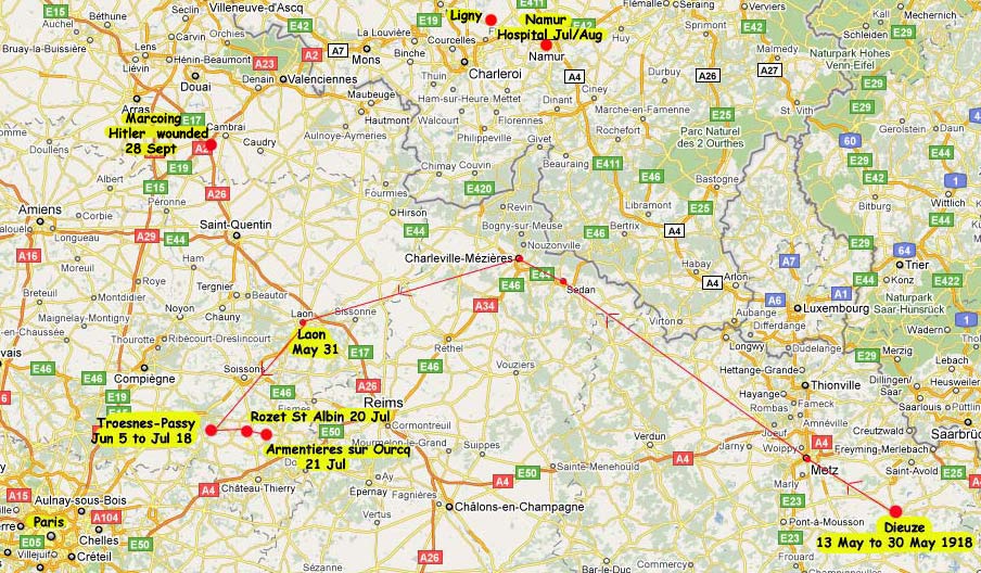 Hitlers movements have been researched in detail and the 16 Reserve Infantry Regiment followed this path during the time Keogh was at the front.
